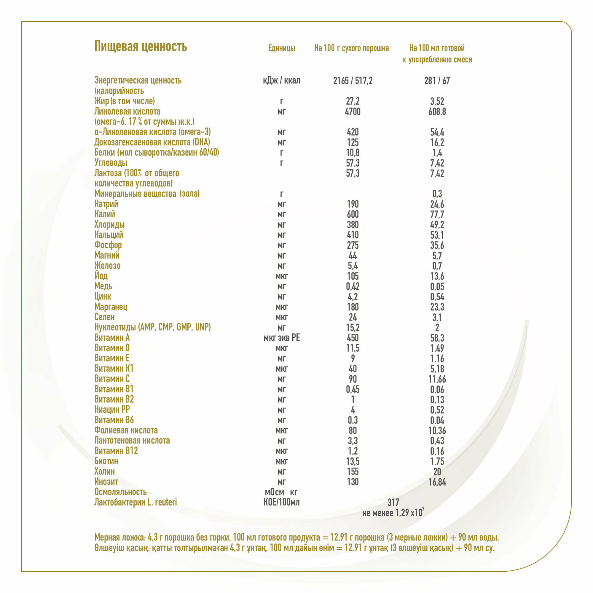 | Состав | сыворотка сухая деминерализованная из козьего молока, смесь растительных масел (подсолнечное высокоолеиновое, рапсовое низкоэруковое, подсолнечное, кокосовое), молоко козье цельное сухое, лактоза, масляная смесь с DHA (подсолнечное масло, рыбий жир), эмульгатор соевый лецитин, цитрат кальция, цитрат калия, хлорид калия, L-фенилаланин, кальциевая соль ортофосфорной кислоты (фосфат кальция), холин битартрат, L-изолейцин, цитрат магния, регулятор кислотности гидроксид натрия, натриевые соли ортофосфорной кислоты (фосфат натрия), L-гистидин, L-триптофан, лактобактерии L. Reuteri (не менее 1х106 КОЕ/г), нуклеотиды |