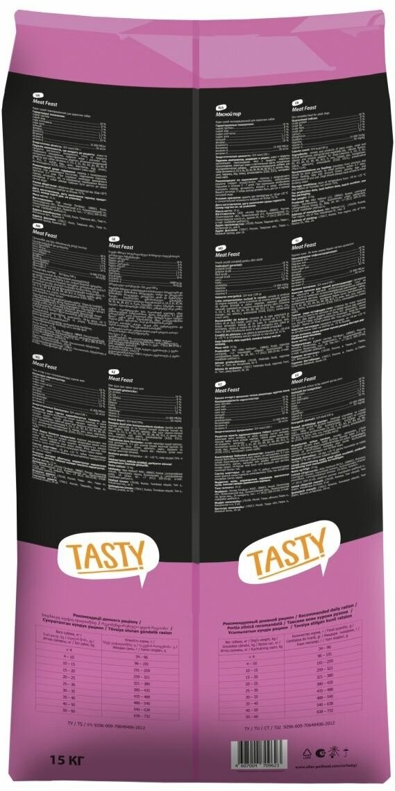 TASTY Корм сухой для взрзрослых собак мясной пир 15кг интересное: