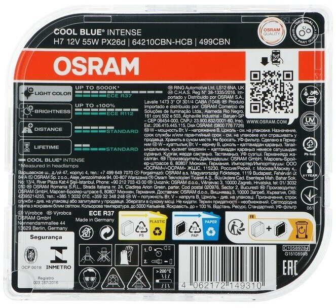 Купить Лампа автомобильная галогенная OSRAM COOL BLUE INTENSE NEXT GEN H7 64210CBN-HCB 12V 55W PX26d 5000K 2 шт.