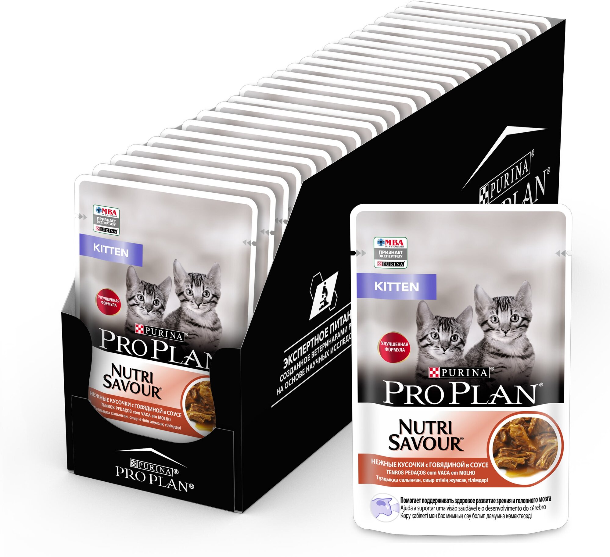 Влажный корм для котят Pro Plan Nutri Savour Kitten, с говядиной в соусе, Пауч, 85 г. Цена за упаковке,в упаковке 12шт (12штх85г).