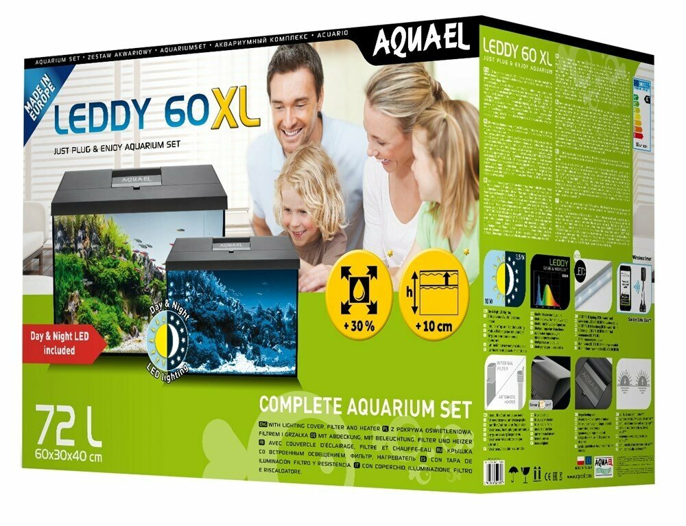 AQUAEL Аквариум LEDDY XL 60 D/N 2.0 черный / 72л прямой, 60х30х40см. Комплектация: крышка, свет Leddy Tube 10Вт Day&Night 2.0, фильтр ASAP 300, нагреватель FIX2 100W. (Польша)