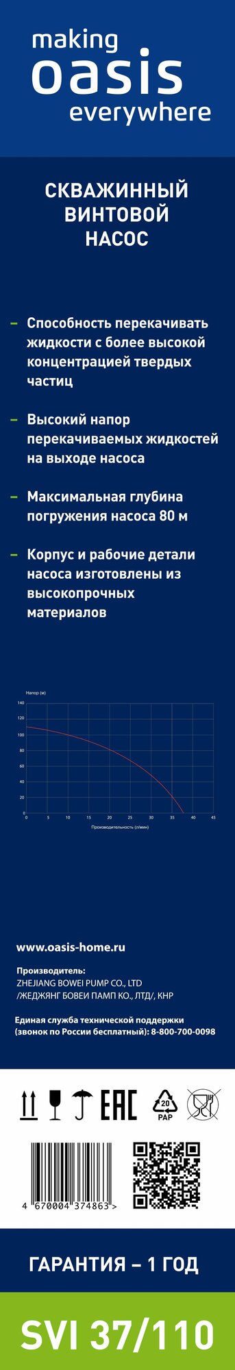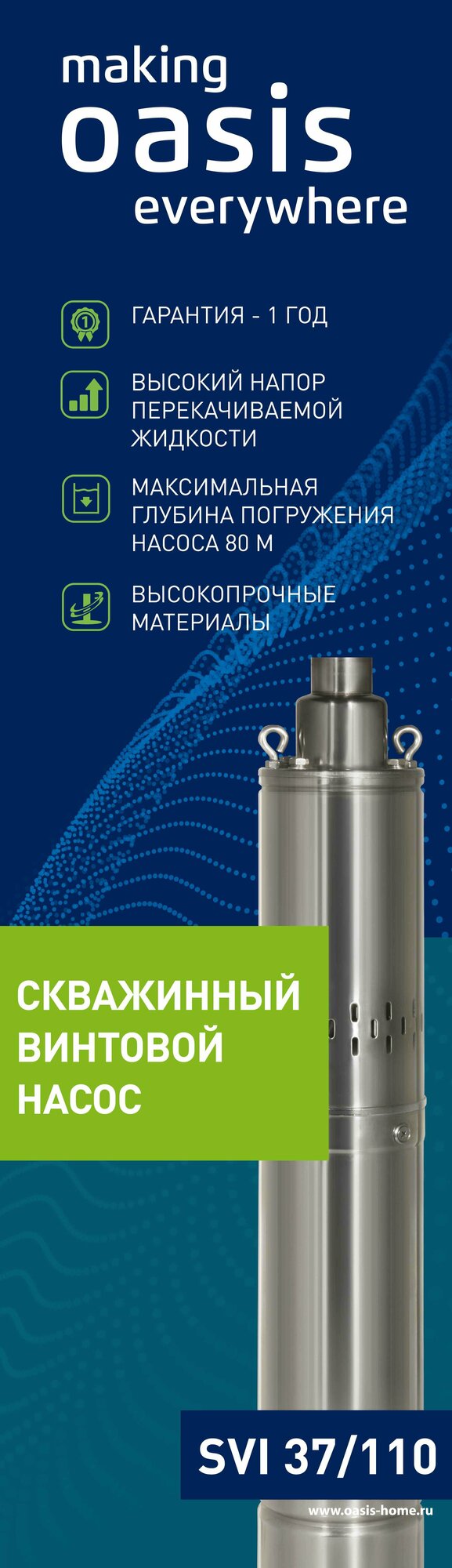 Насос скважинный Oasis SVI 37/110, винтовой, 550 Вт, напор 110 м, 37 л/мин, кабель 20 м OASIS 134211 .