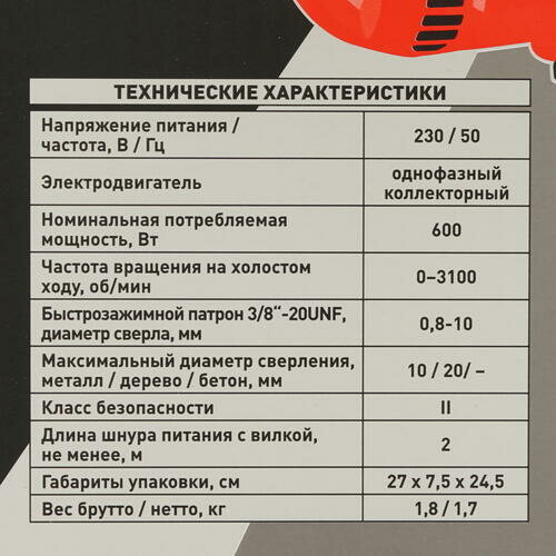 Дрель безударная парма ДЭ-01-10/600P 02.025.00005, 600 Вт