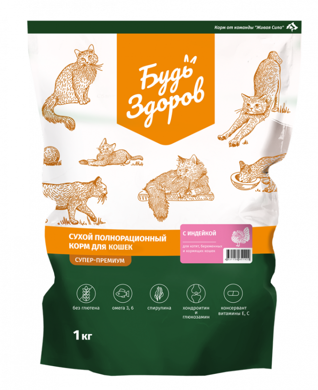 1 кг Будь Здоров Корм для котят, беременных, кормящих кошек с Индейкой, Сухой полнорационный