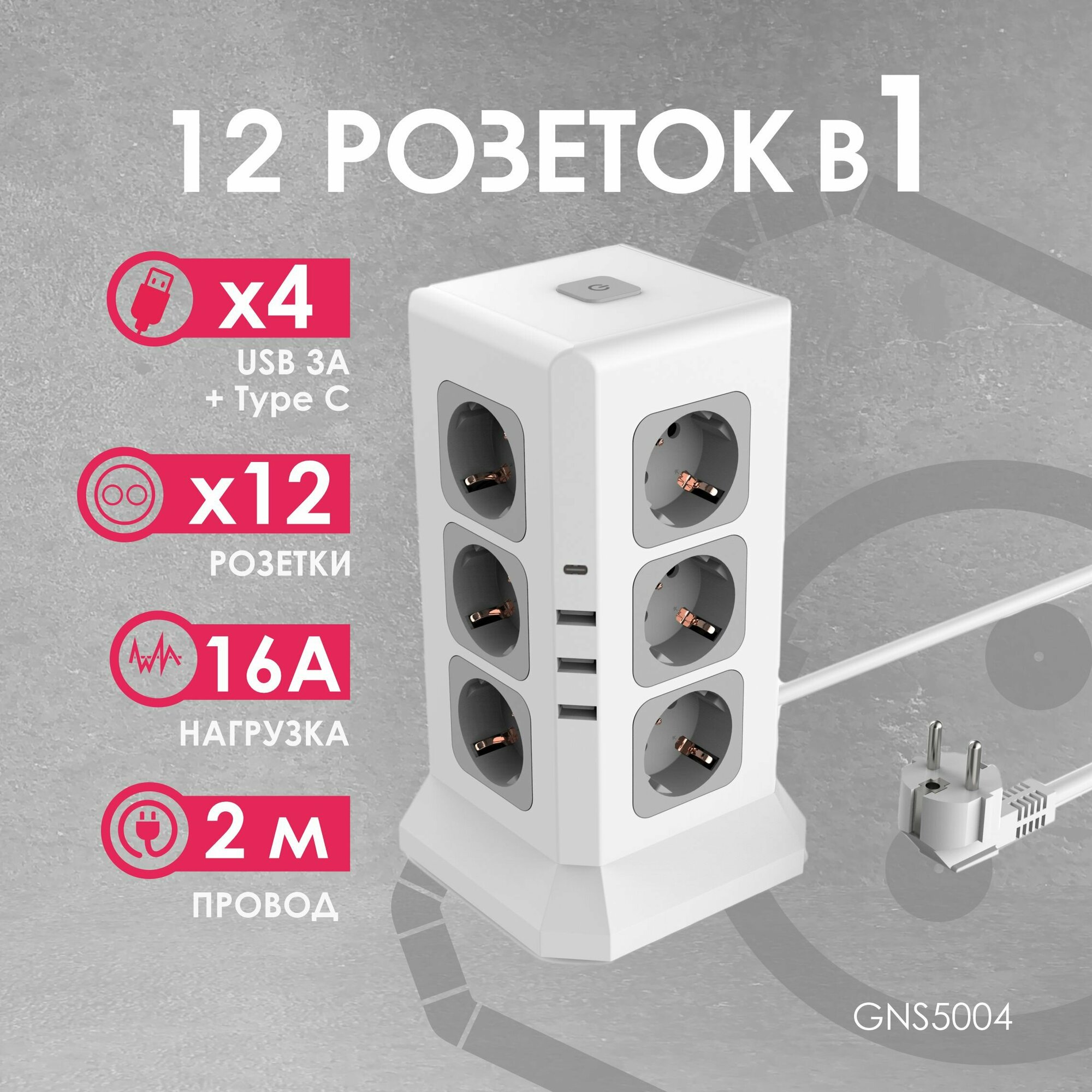 Купить GNS5004 Удлинитель Tower Extended 12 Euro 16A, 4 USB 3A+C с блоком 5В/3.4А, кабель 2,0м RocketSocket, цвет белый-серый Ливолотач