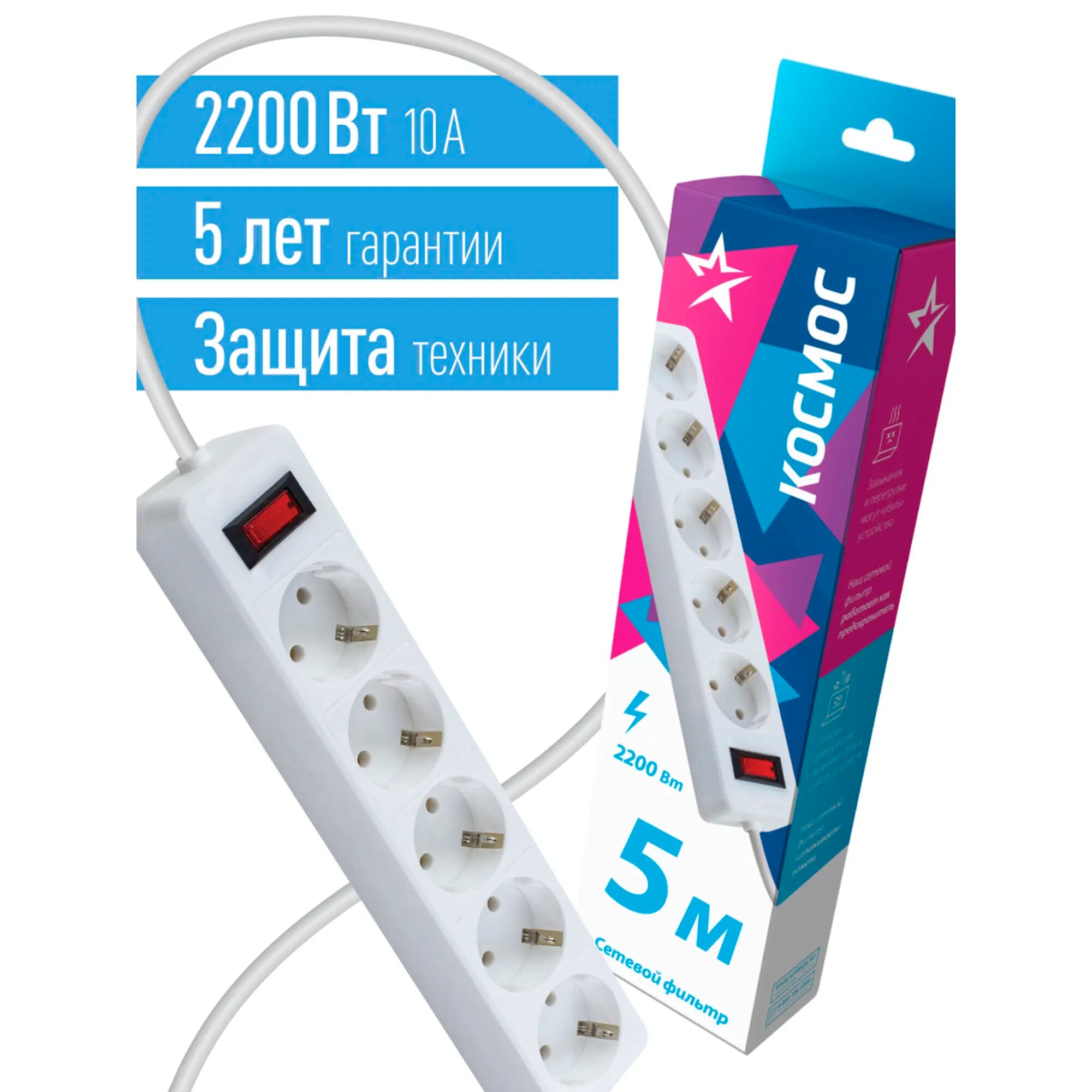 Сетевой фильтр космос 5 м, 5 розеток, пвс 3х0,75мм2, белый