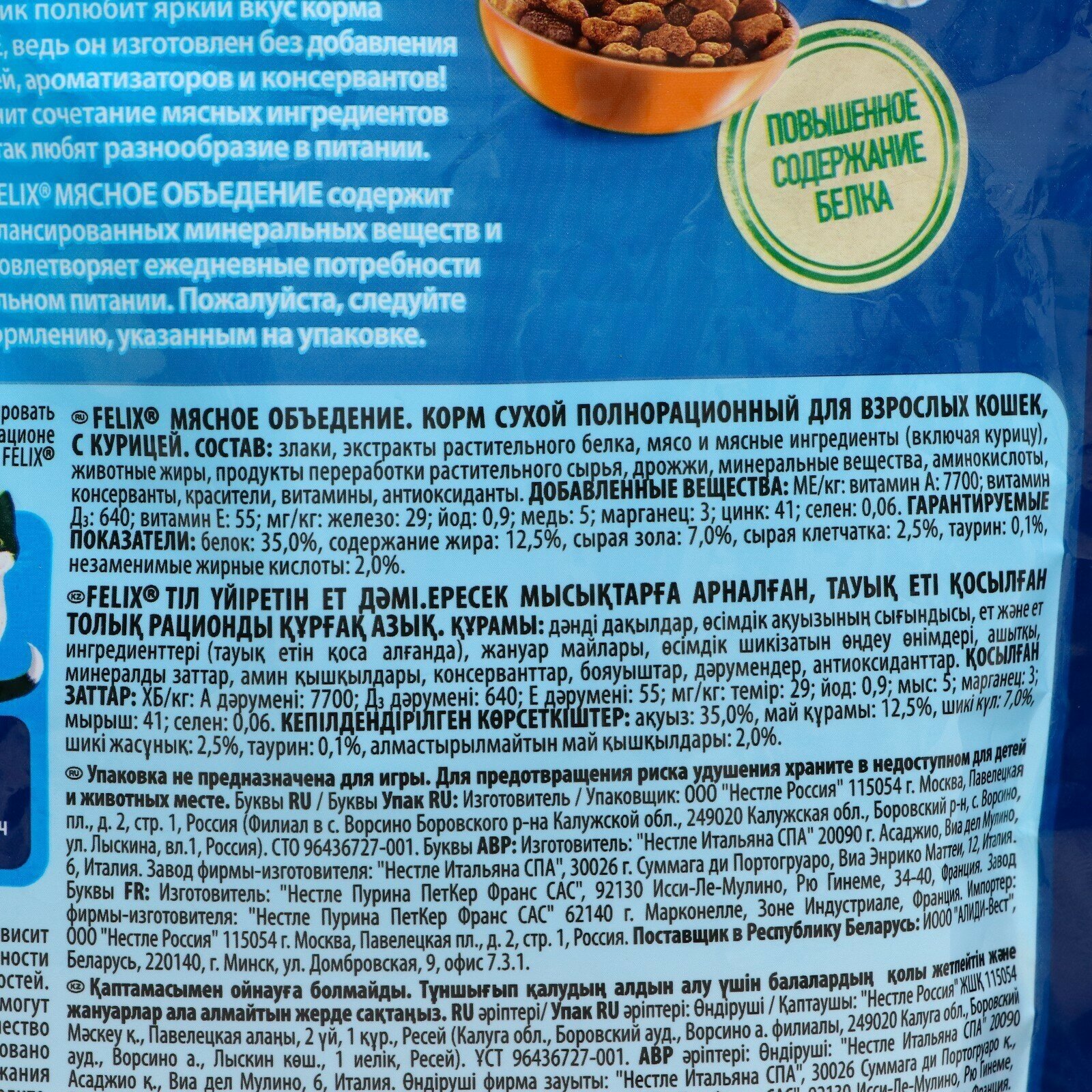 | Состав | злаки, экстракты растительного белка, мясо и мясные ингредиенты (включая курицу), животные жиры, продукты переработки растительного сырья, дрожжи, минеральные вещества, аминокислоты, консерванты, красители, витамины, антиоксиданты |