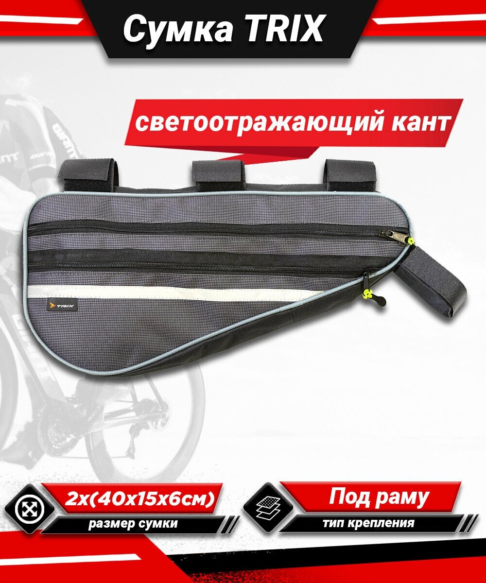 Купить Сумка TRIX велосипедная , крепление под раму за рулевой стакан, большая, 40х15х6см, водонепроницаемая, светоотражающие вставки, серая вс028.040.1.0