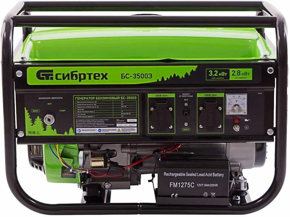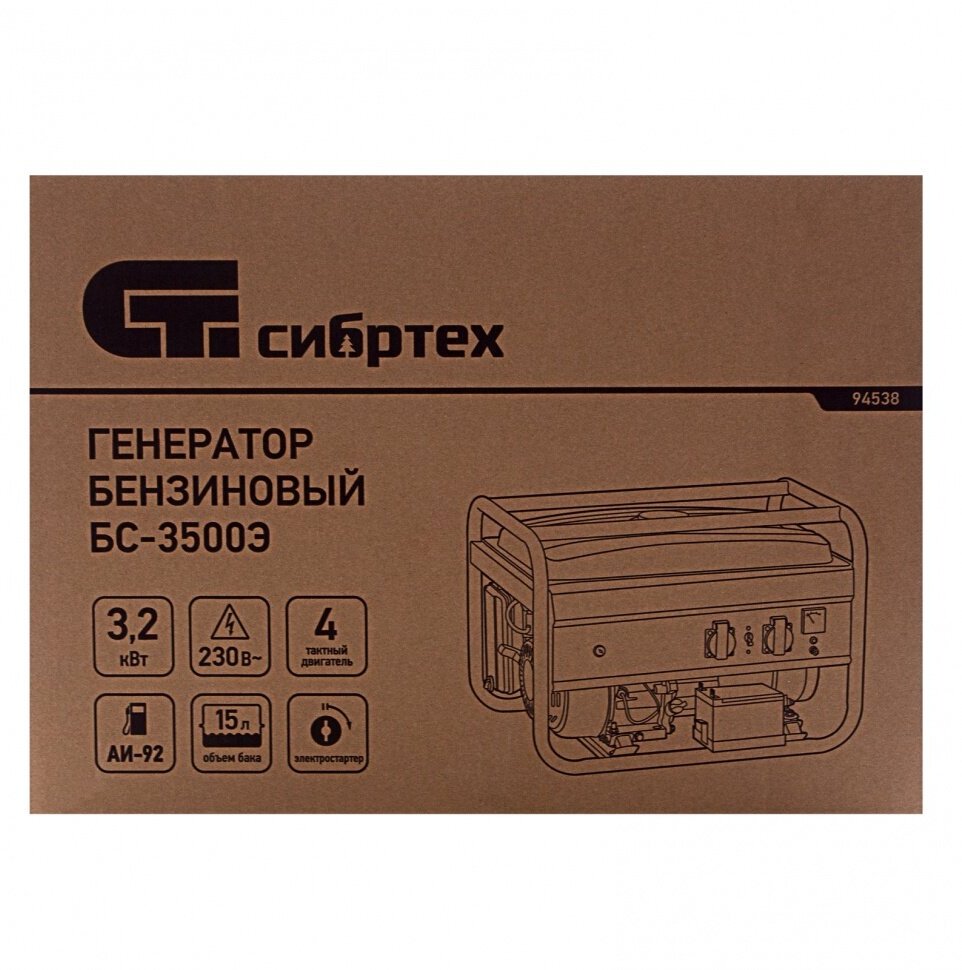 Бензиновый Генератор СИБРТЕХ БС-3500Э, 3.2 кВт, 230В, 15 л, электростартер,