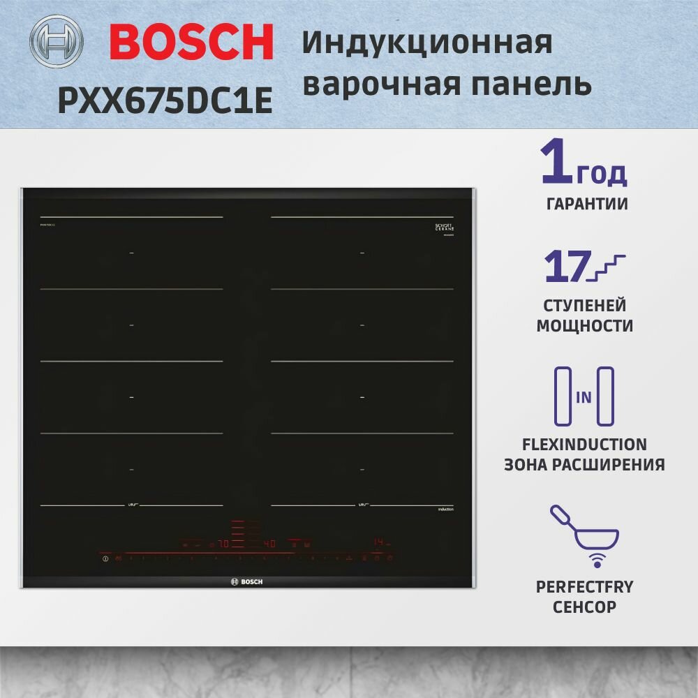 Индукционная варочная панель Bosch PXX675DC1E, цвет панели черный, цвет рамки серебристый