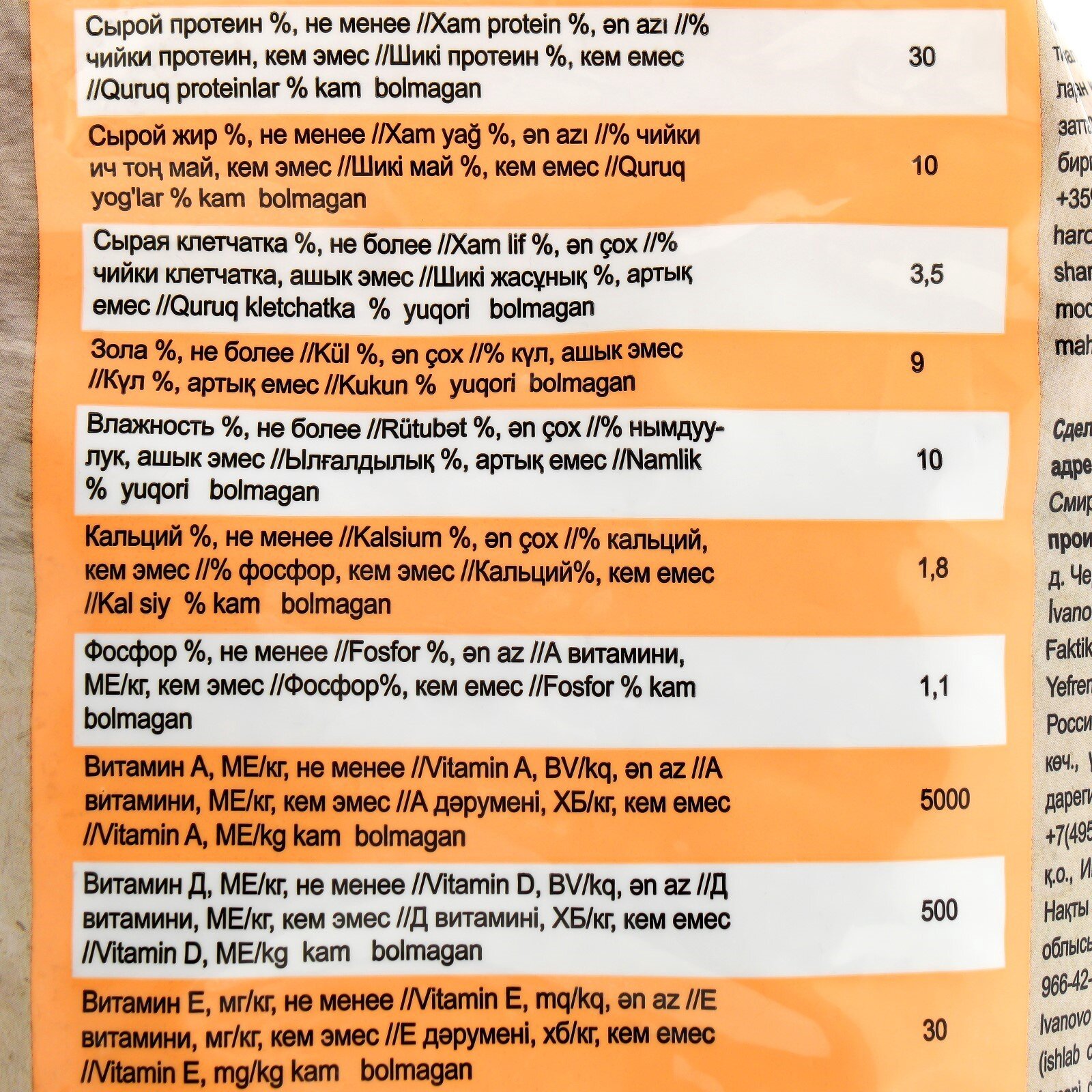 | Пищевая ценность | протеин - не менее 30 %, жир - не менее 10 %, зола - не более 9 %, клетчатка - не более 3,5 %, влажность - не более 10 % |