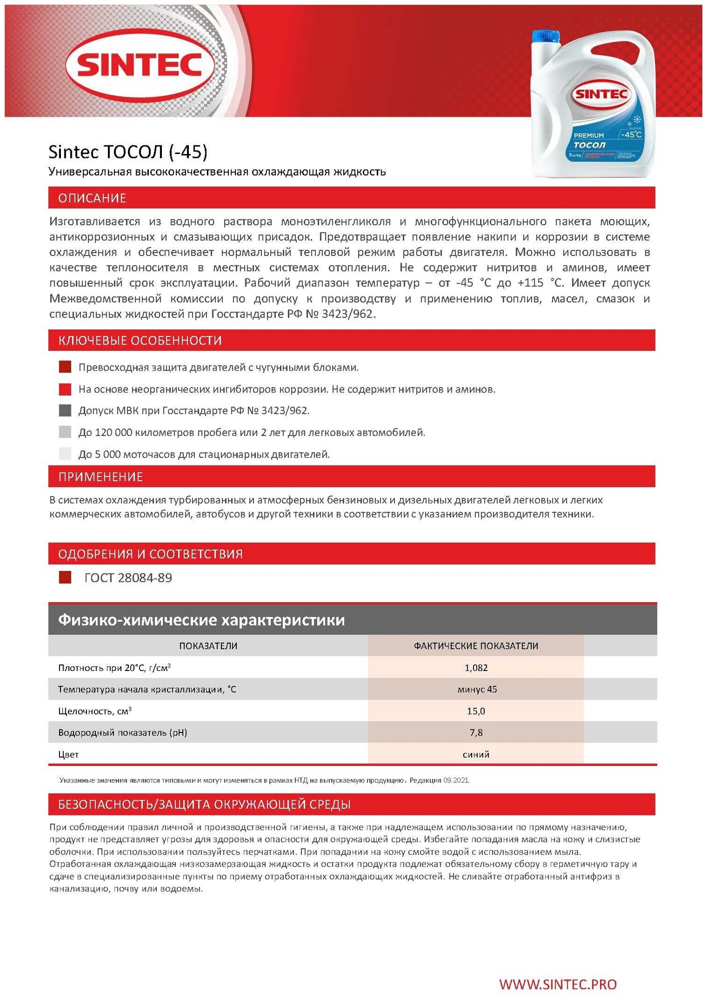 Тосол 45 SINTEC готовый 10кг -45°С синий интересное: