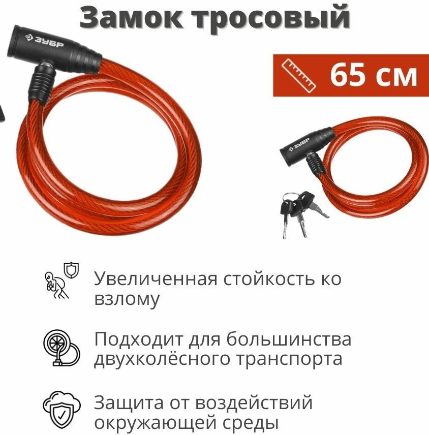 ЗУБР 650 мм, d 10 мм, 3 ключа, тросовый замок (37263-65)