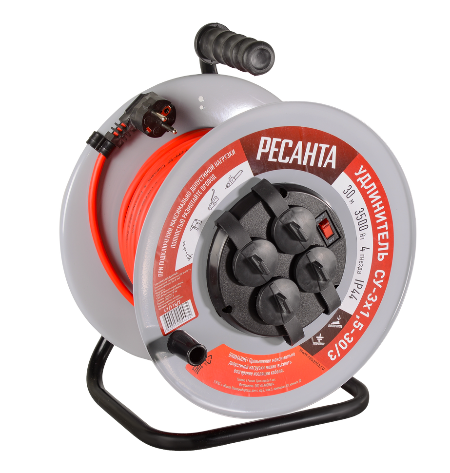 Удлинитель РЕСАНТА СУ-3х1,5-30/3 // 30м, 4 розетки, катушка -металл, с выключателем, силовой