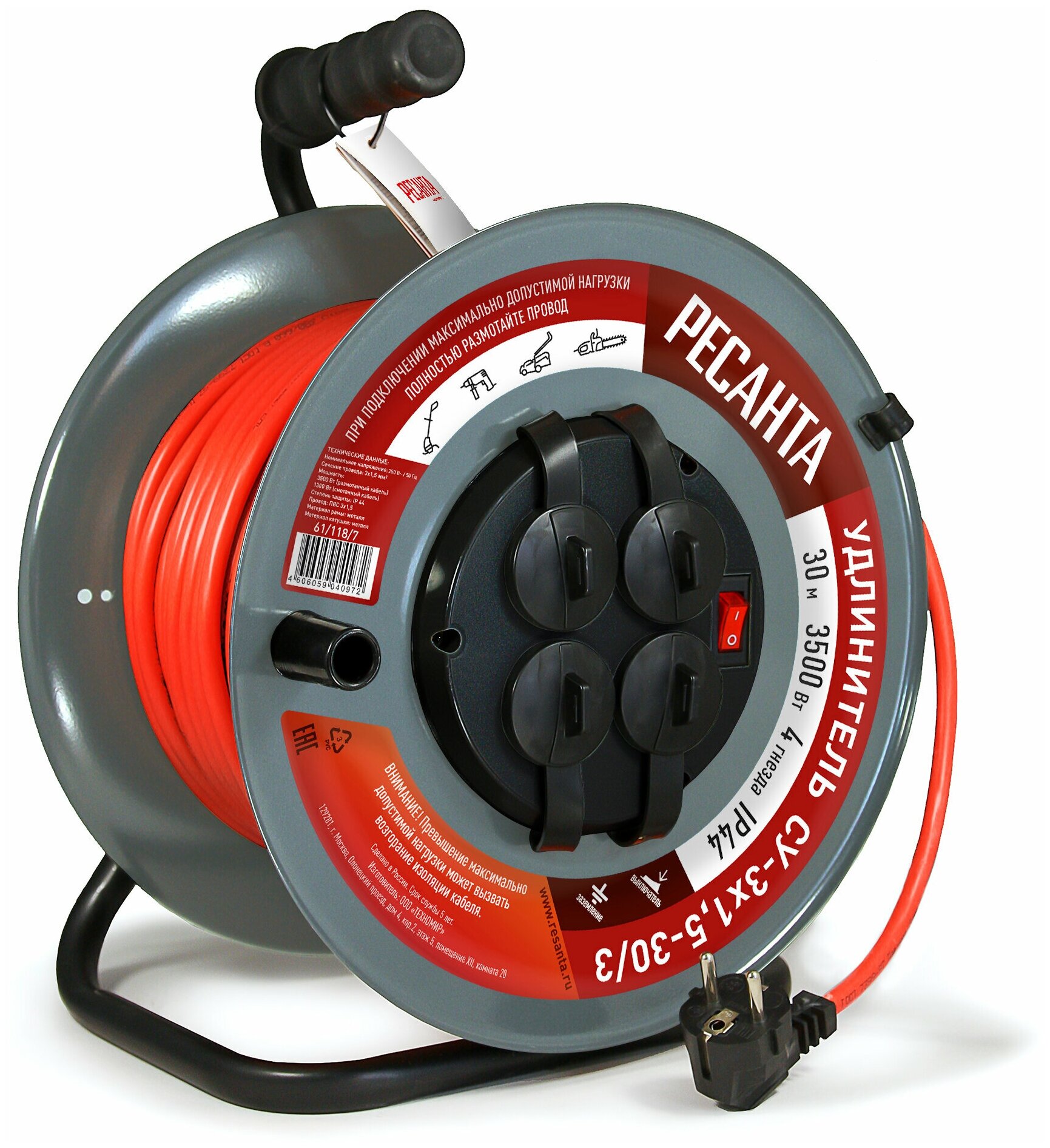 Удлинитель силовой на катушке Ресанта (СУ-3х15-30/3), с выключателем, 4 розетки, IP44