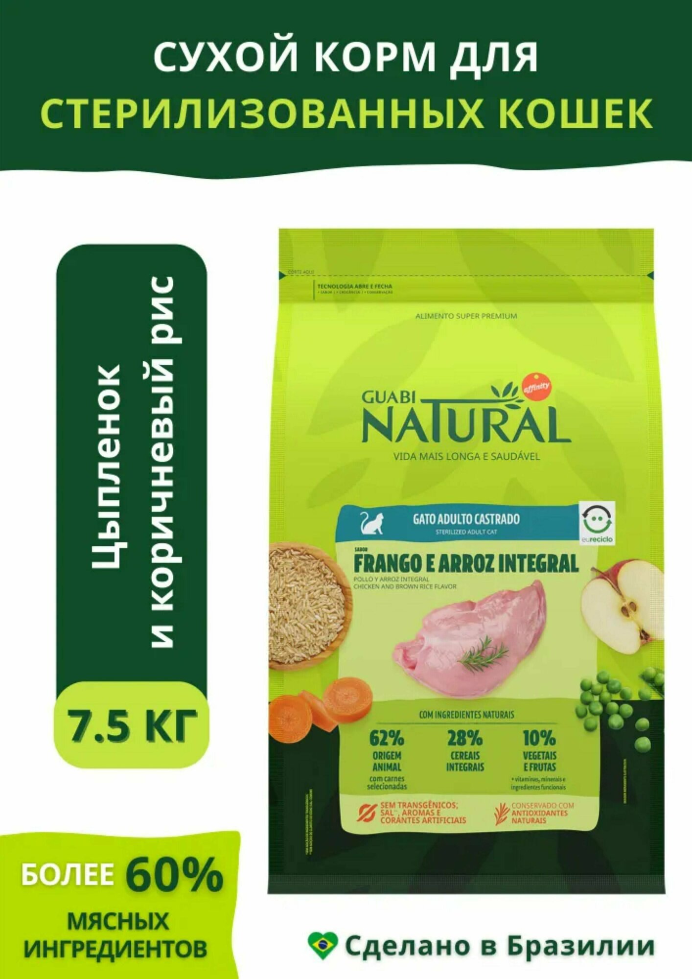 Сухой корм для стерилизованных кошек Guabi Natural, , с цыпленком, с коричневым рисом 7.5 кг