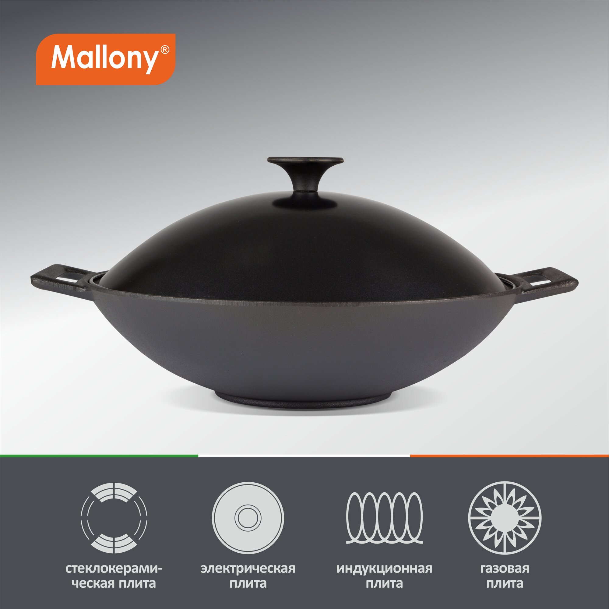 Сковорода-вок Mallony чугунная 31 см, металлическая крышка