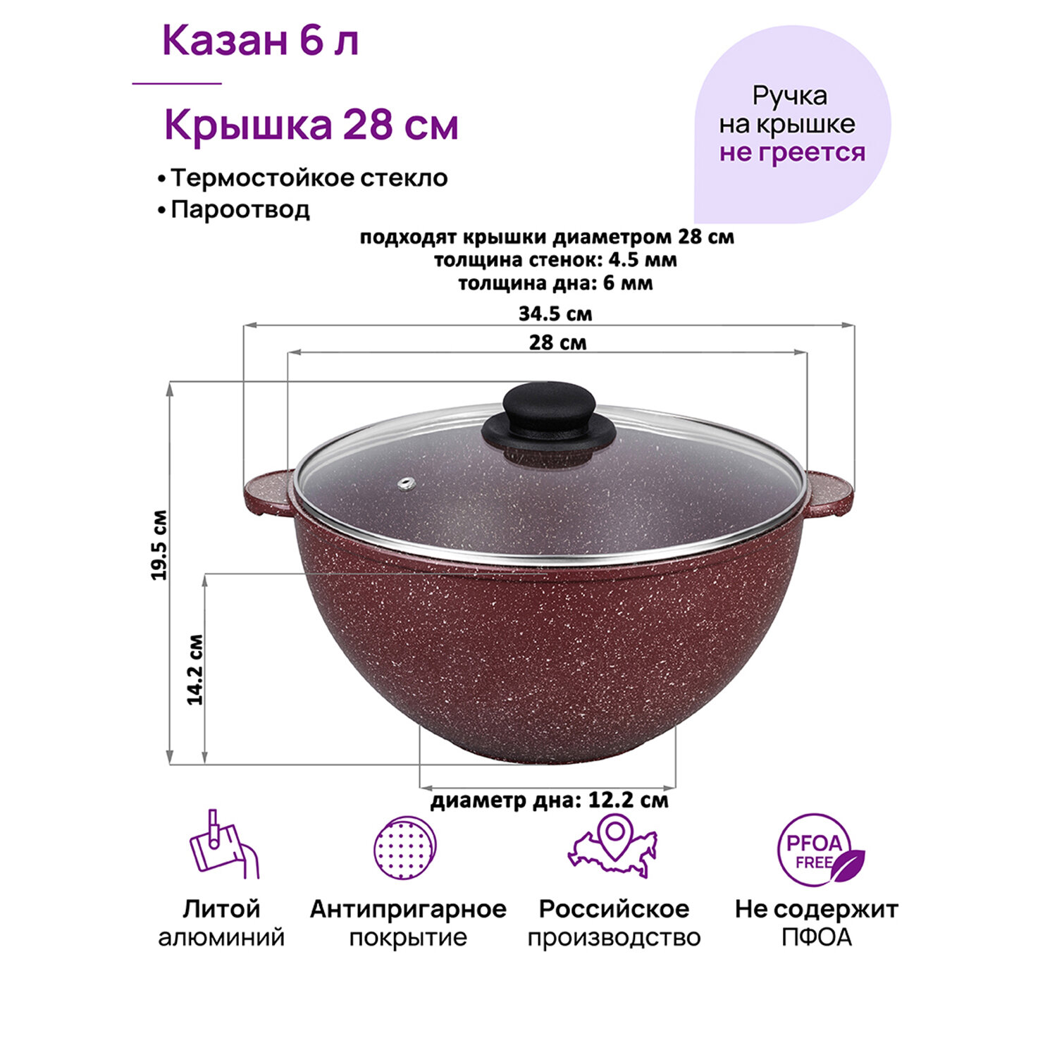 Казан 6 л гармония вкуса "Рубин" С крышкой ф28, 34,5*29,5*19,5 см