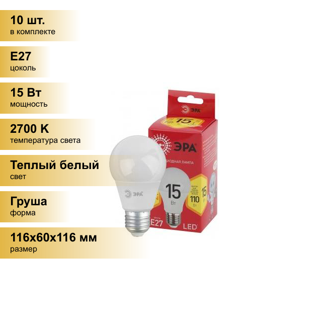 (10 шт.) Светодиодная лампочка ЭРА ECO ЛОН A60 E27 15W(1200lm) 2700K 2К 116х60 A60-15W-827-E27 7707