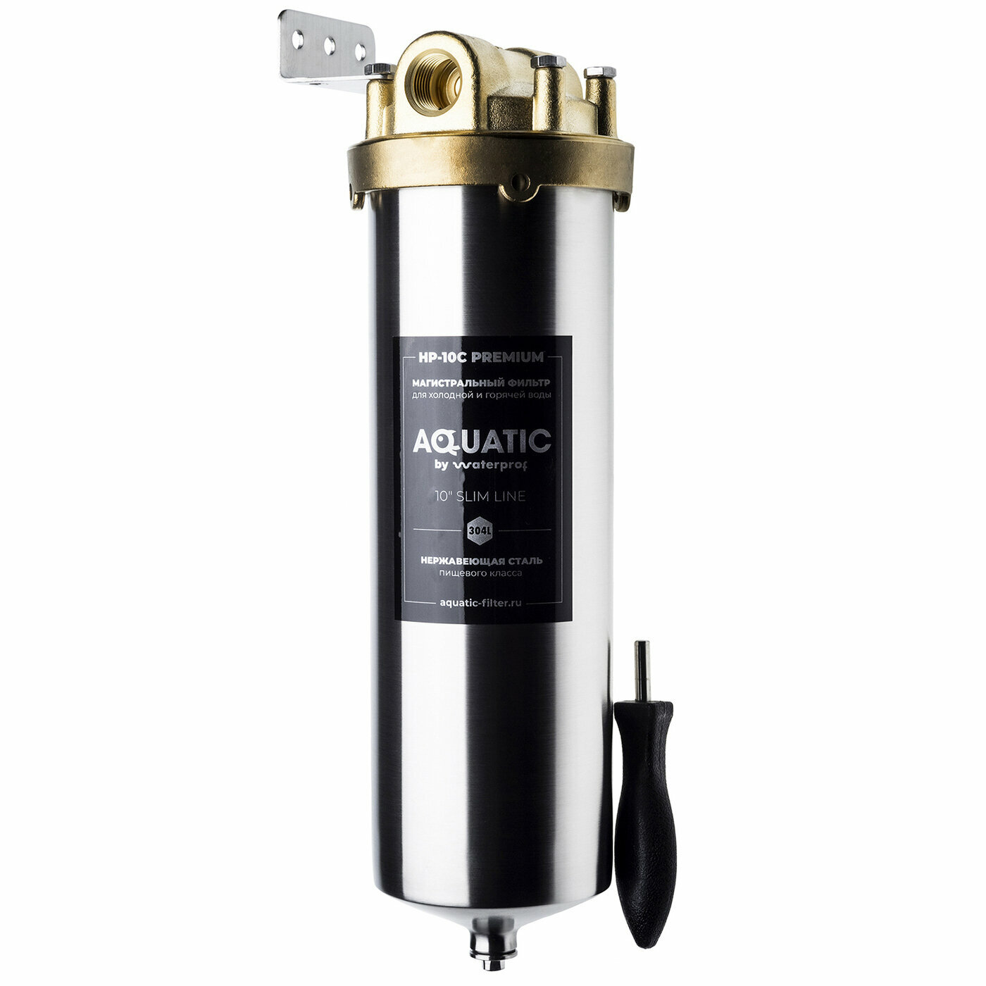 Фильтр магистральный 10SL для горячей и холодной воды Aquatic HP-10 C 1/2 Premium. Нержавеющая сталь, латунь, слив