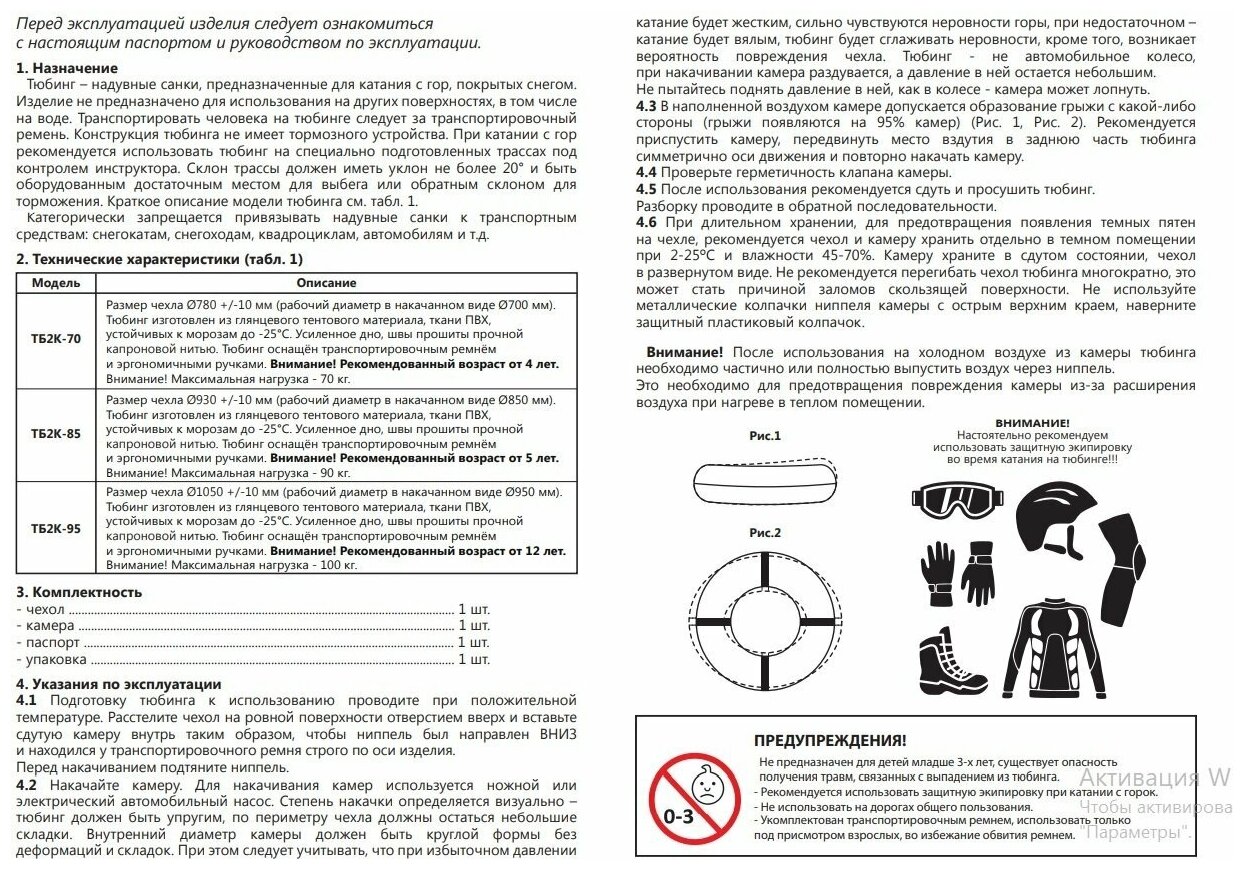 | Диаметр тюбинга | 70 см |
