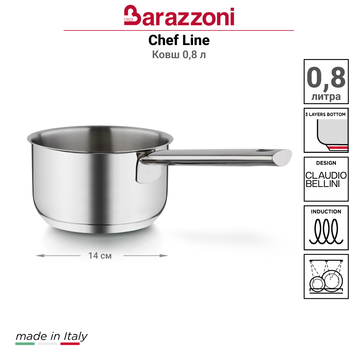 Ковш Barazzoni Chef Line, 14 см, 0.8 л, нержавеющая сталь 18/10, цвет серебристый (163110014)