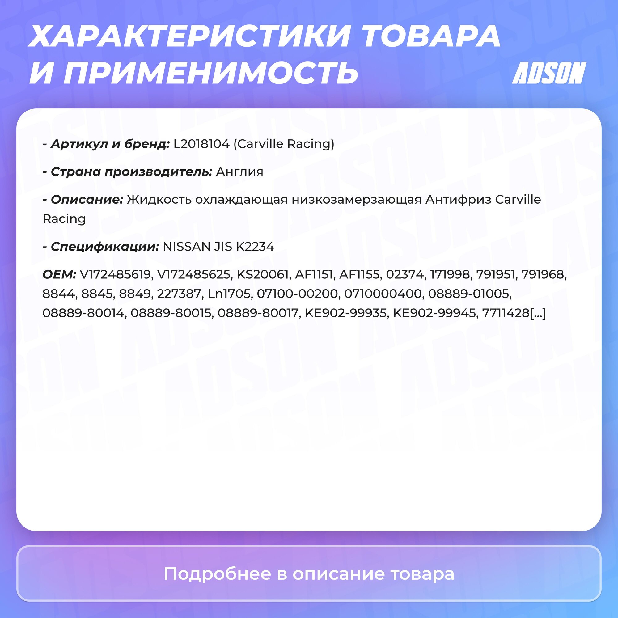 Антифриз Гибридный Флуор. -40°С, G11, Зеленый, Готовый, 5Л/5.36Кг Carville Racing L2018105 Carville Racing арт. L2018105