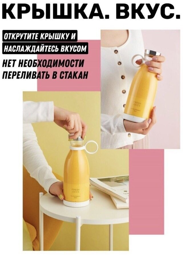 Портативный блендер бутылка для смузи NATURAL JUICEбелый /Беспроводной миксер на 350 мл с хромированной крышкой/Блендер-соковыжималка интересное: