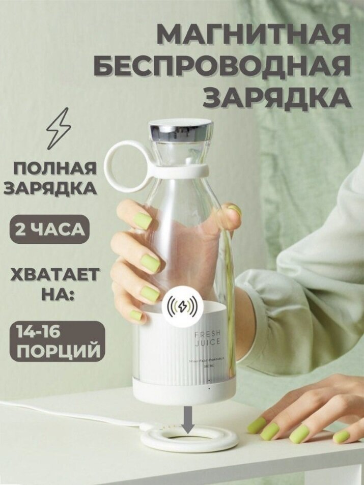 Купить Портативный блендер бутылка для смузи NATURAL JUICEбелый /Беспроводной миксер на 350 мл с хромированной крышкой/Блендер-соковыжималка