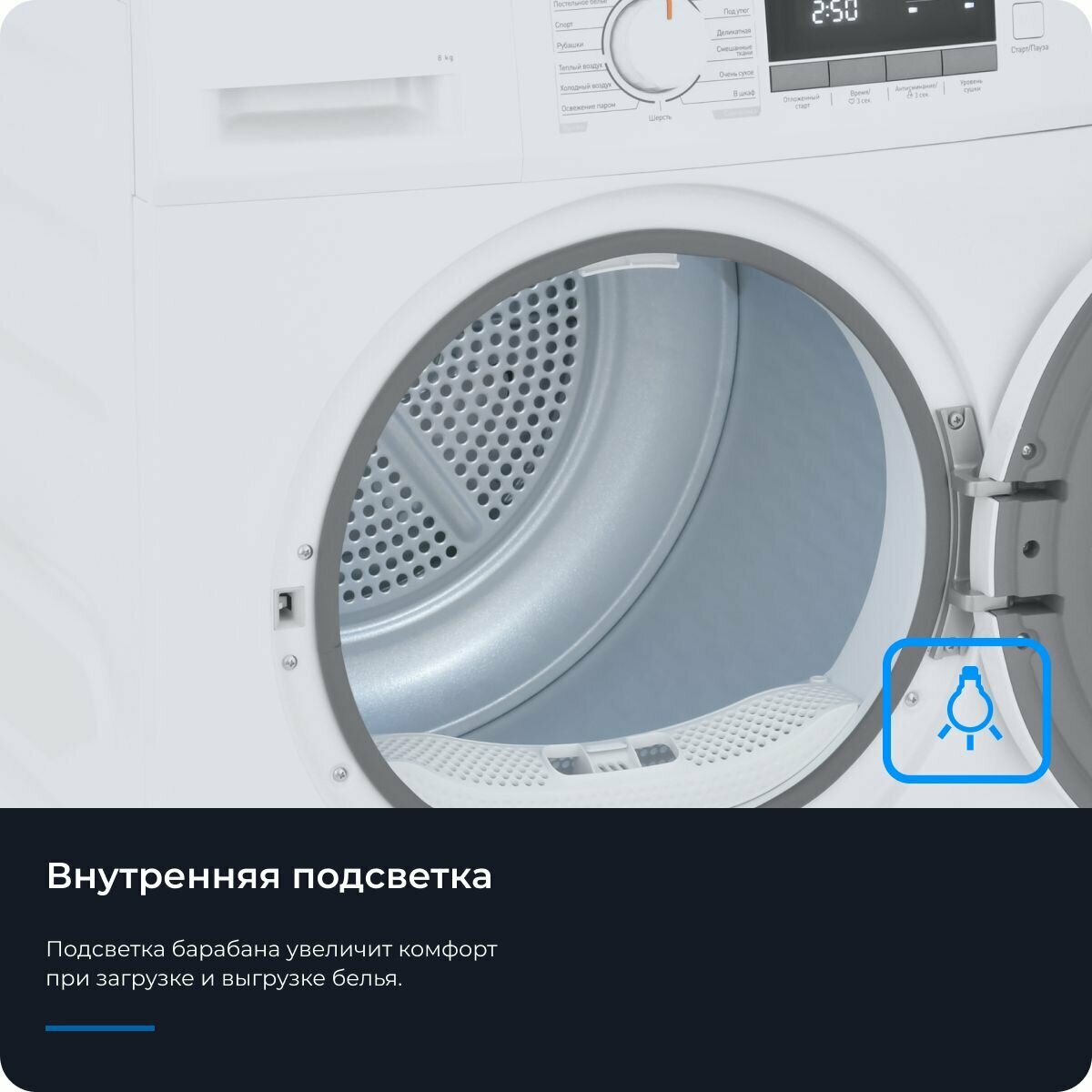 | Отзыв: | Сушилка экономит место в квартире и время. Загрузка 8 кг, больше чем надо, так как к меня стиральная машина даже меньше вмещает. Есть функция защиты от сминания, удобно, иногда не приходится гладить. Программ 16, пользуюсь несколькими. Сушит качественно, даже с постельным бельем справляется. |