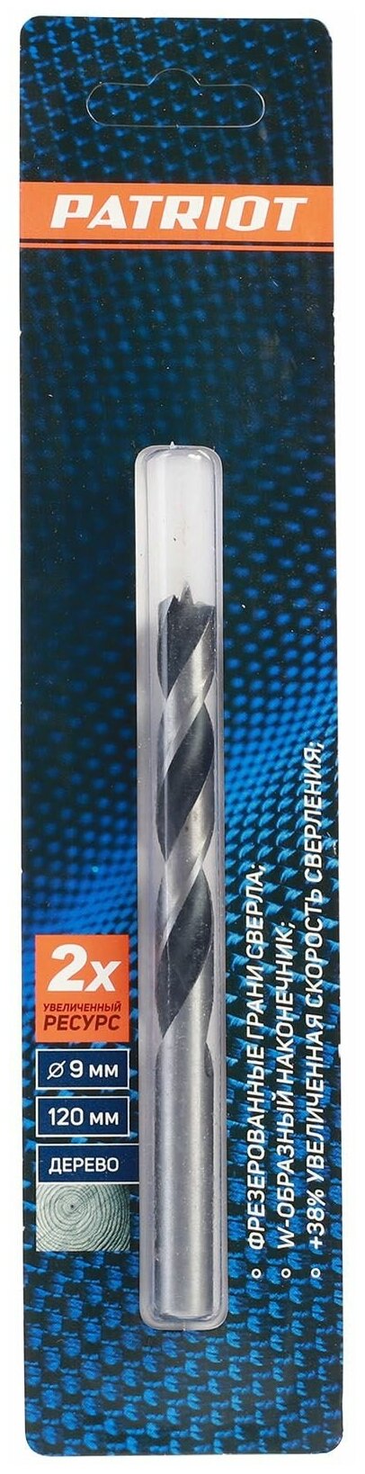Сверло PATRIOT по дереву спиральное 9 мм, W-образная заточка, 1 шт в блистере