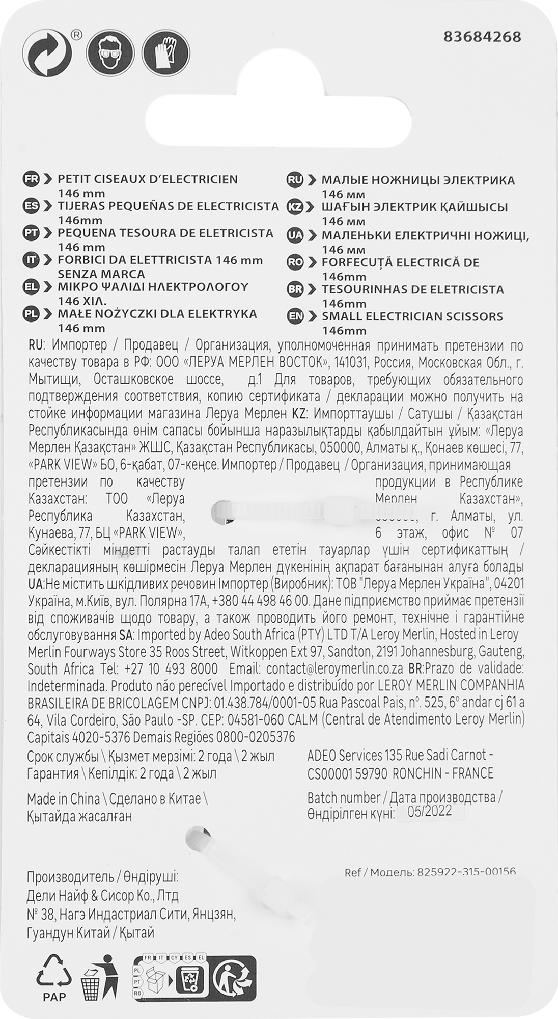 | Дополнительная информация | Ножницы для резки кабеля146 мм |