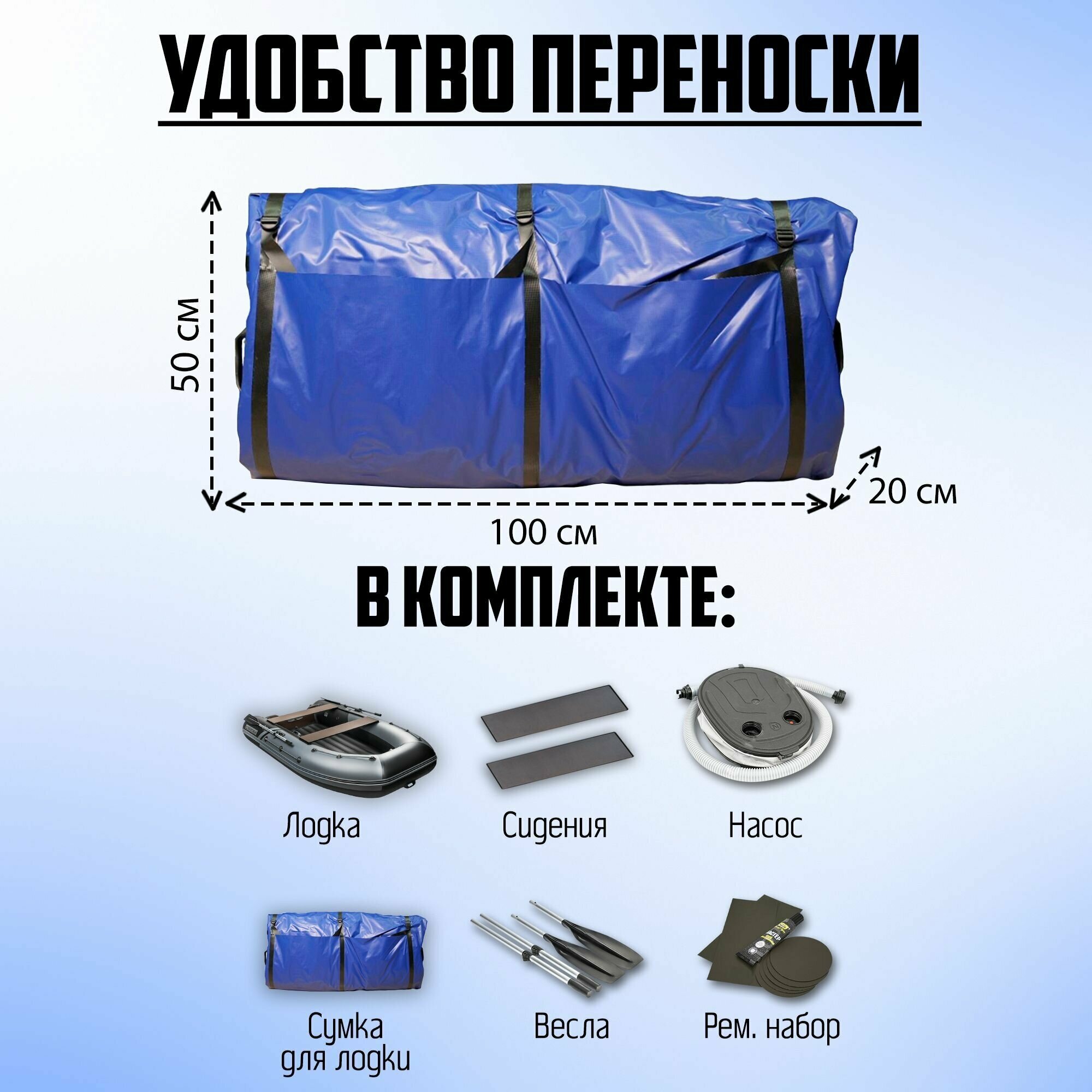 | Состав набора | Лодка, 2 сиденья, 2 весла разборных, ножной насос 5 литров, рем. набор, сумка, паспорт изделия |