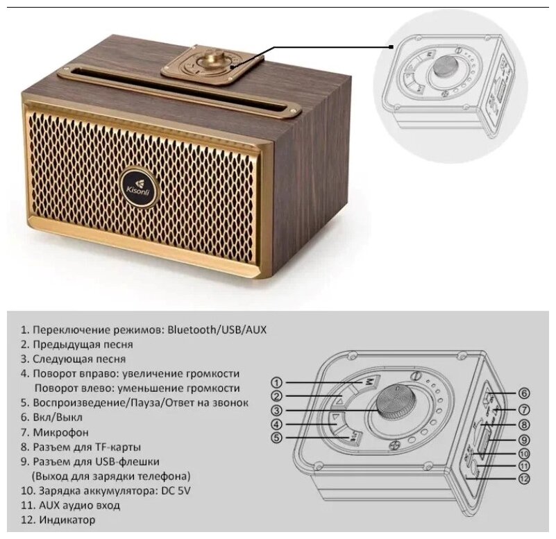 Колонка очень стильная. Звучание хорошее. Есть вход под флеш-карту. Подставка под телефон. Есть радио. В комплекте не было инструкции, но разобраться в кнопках и разъемах труда не составит.