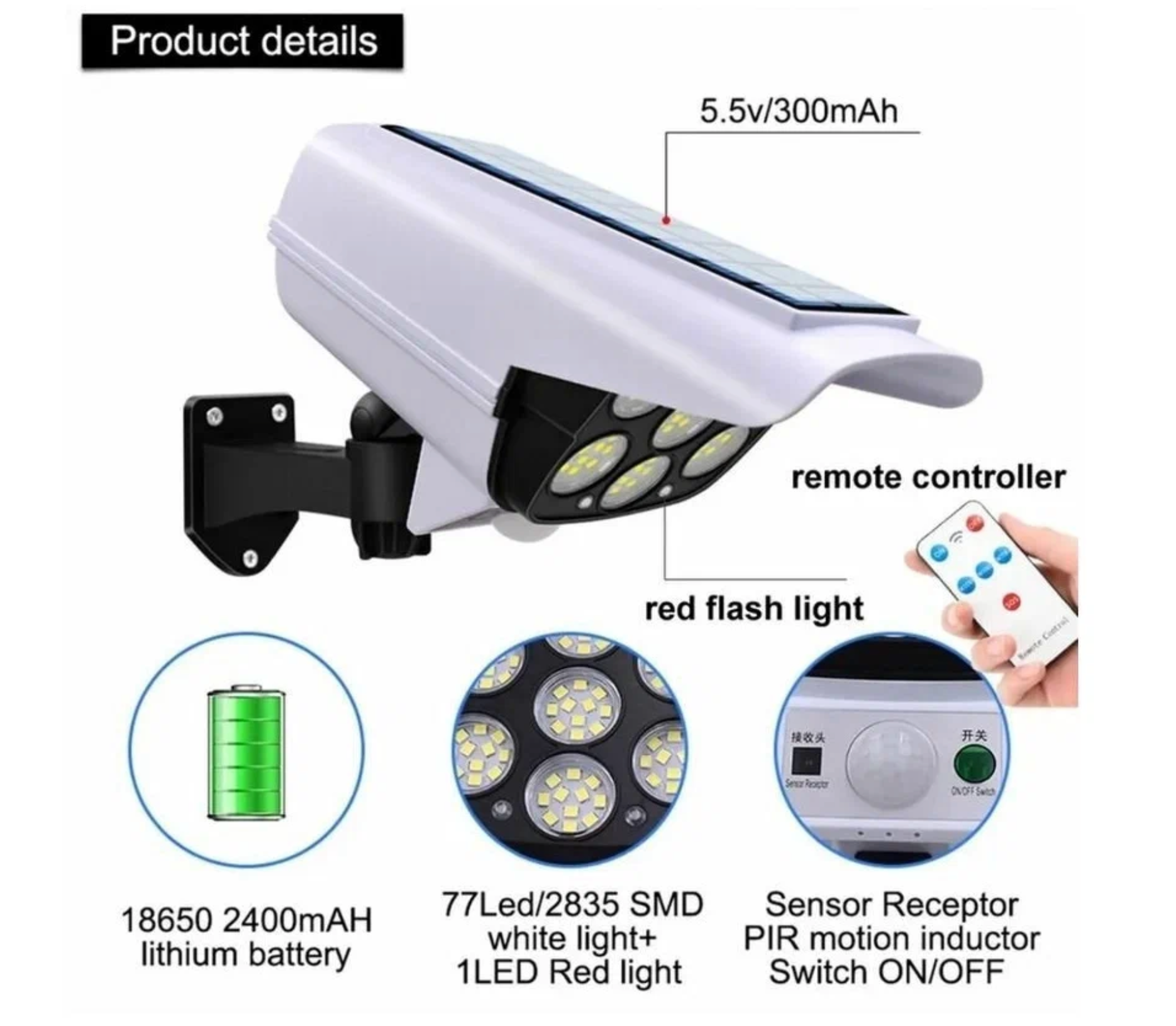 Купить Прожектор уличный фонарь на солнечных батареях с датчиком движения и пультом 77 LED муляж видео камеры