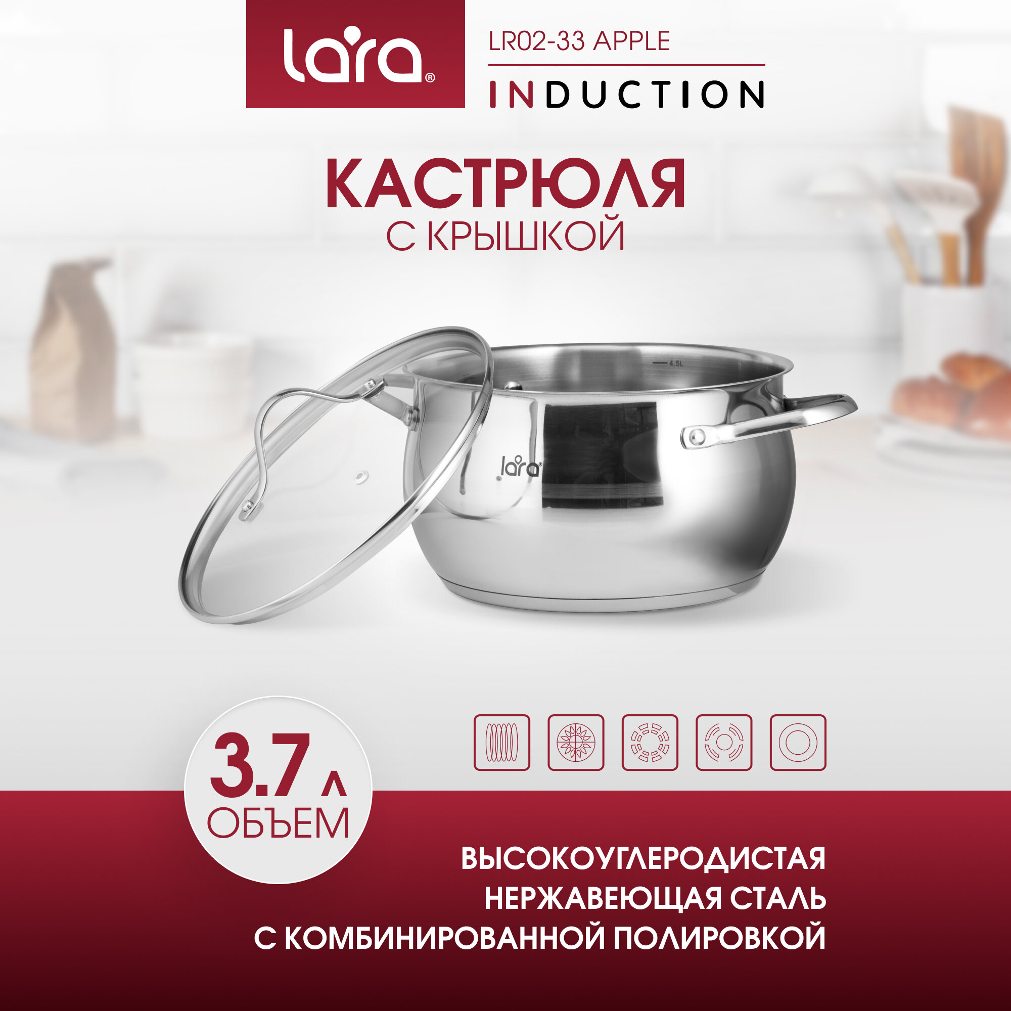 LR02-33 Кастрюля LARA (нерж) серия APPLE 20x11,5см,3.7л,стал.ручки,капсулир индукц дно,крышка стекло