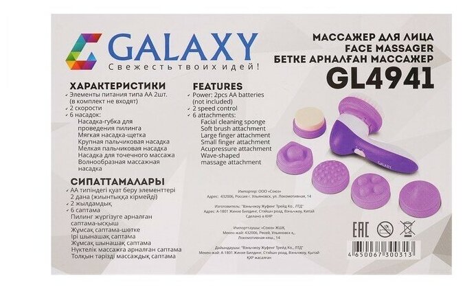 Galaxy Массажер для лица Galaxy GL 4941, 6 насадок, 2 скорости, 2хАА (не в комплекте)