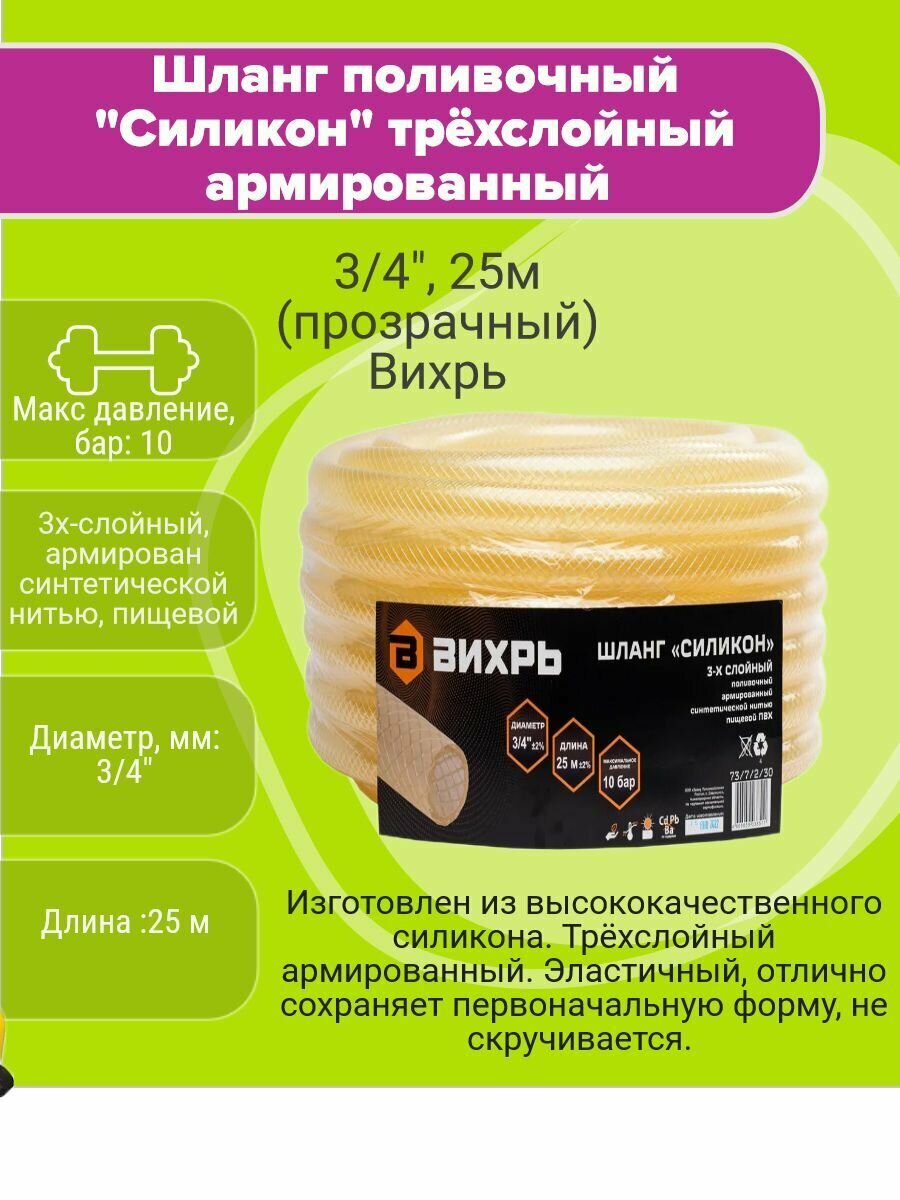 Купить Шланг поливочный "Силикон" трёхслойный армированный 3/4", 25м (прозрачный) Вихрь