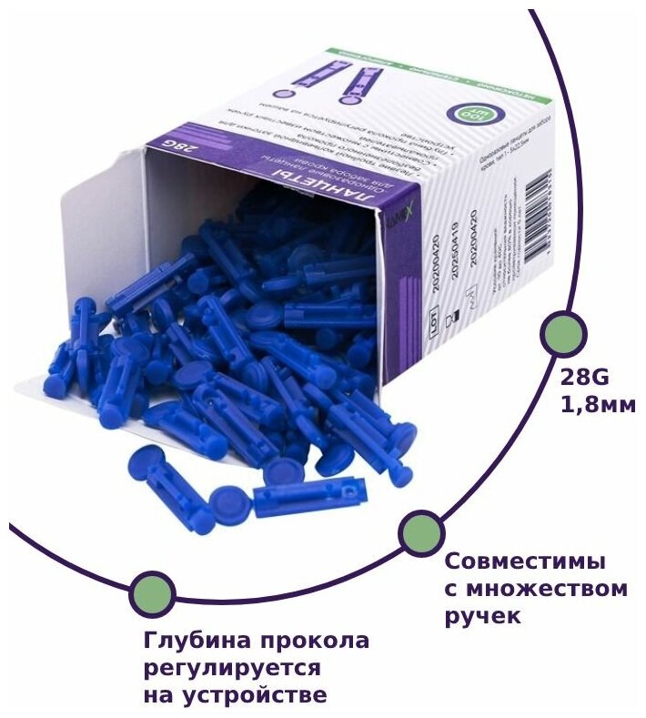 | Отзыв: | Совместимы с разными ручками-прокалывателями, информация об этом указана на коробке. Нормальные ланцеты, самое главное, подходят к моему глюкометру. |