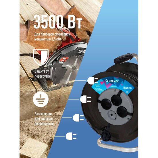 Удлинитель на катушке 4х50м с заземл. 16А IP20 3.5кВт ПВС 3х1.5 космос YKKsm50m-4g-Z(16A)