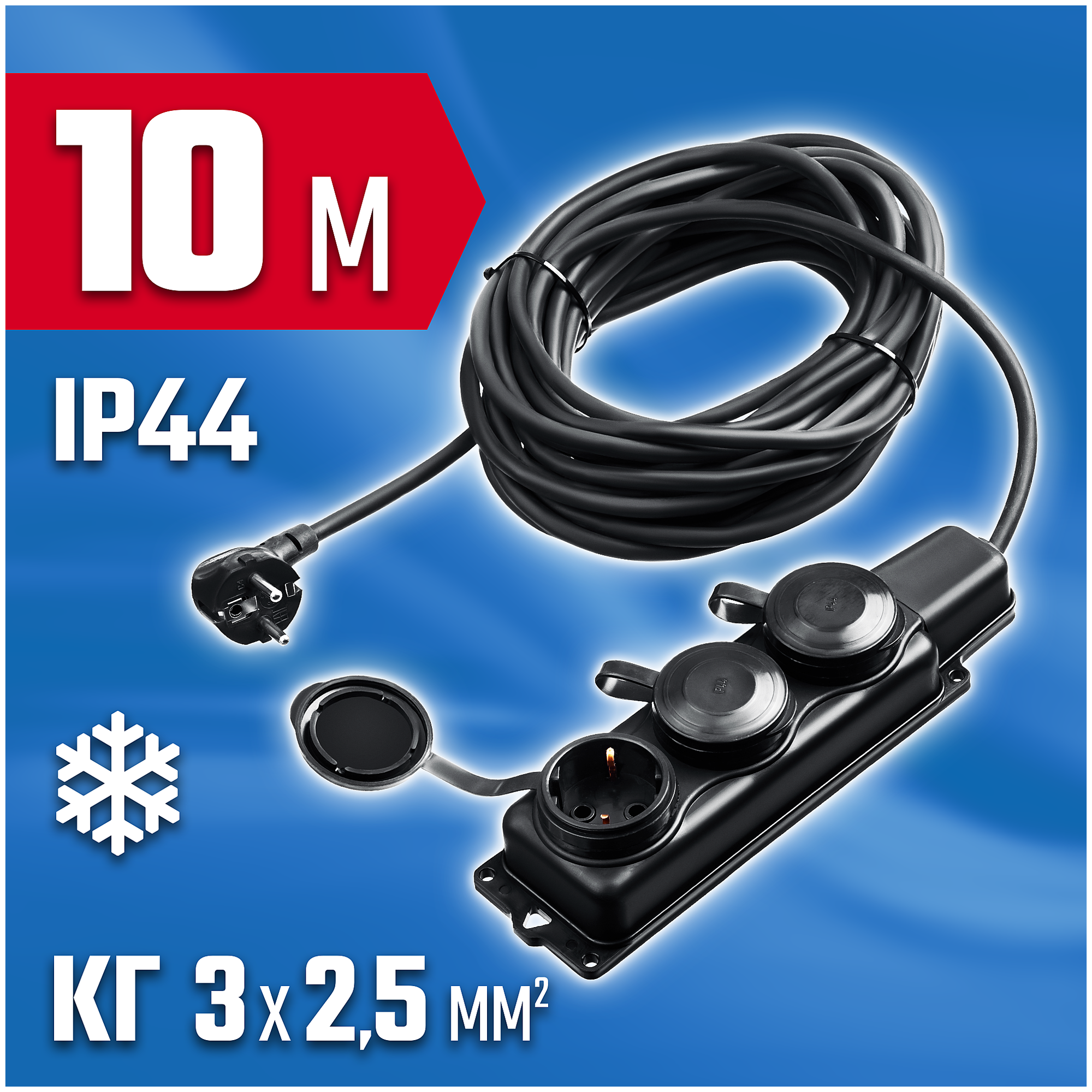 Силовой удлинитель ЗУБР КГ 3х2.5 10м 3гн. 4000Вт IP44, КГ 325-Ш3, Профессионал