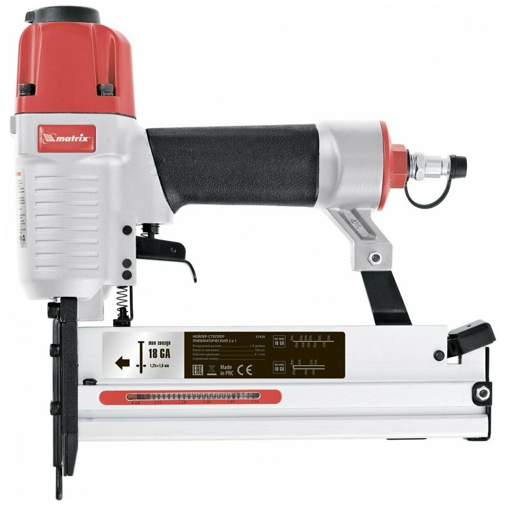 Пистолет пневматический MATRIX 57428, 2 в 1, с регулировкой глубины, гвозди 18GA, скобы 18GA