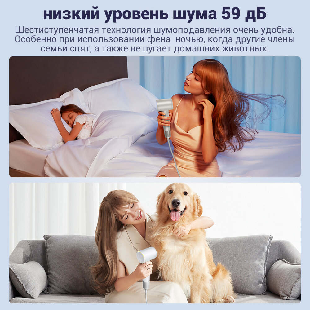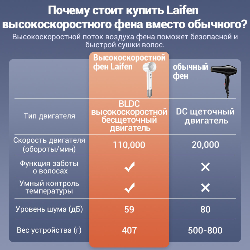 Быстро сушит Низкий уровень шума Красивая подсветка Аналог dyson, оригинальный дайсон тоже есть, различий не увидела ни в скорости сушки ни в качестве волос после сушки. |