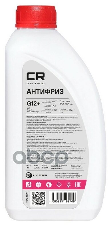 Антифриз cr g12+ oat -40с, красный, готовый, 1кг0.94л (l2022755), CARVILLE RACING L2022755 (1 шт.) интересное: