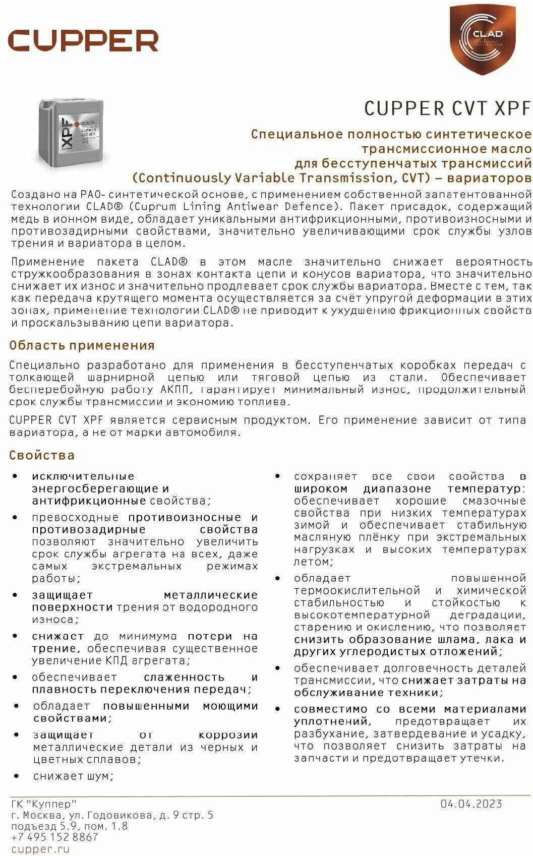 Масло трансмиссионное CUPPER CVT XPF (1 л) интересное: