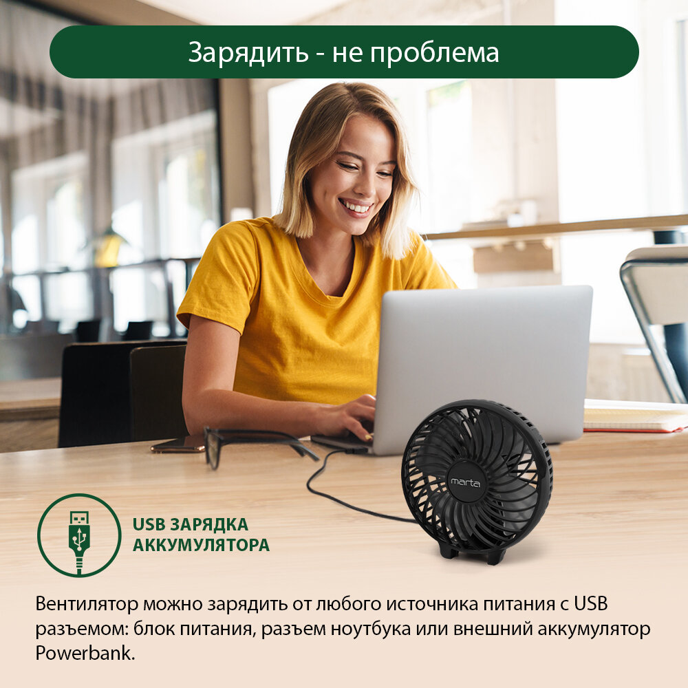 Портативный USB вентилятор со складной ручкой MARTA MT-FN2546 черный/черный интересное: