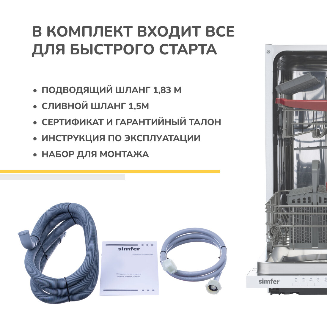 | Дополнительная информация | Корзина для столовых приборов, полка для чашек и столовых ножей, стандартный впускной шланг, стандартный сливной шланг, винты 2 шт, зажимная лента, инструкция и гарантийный талон |