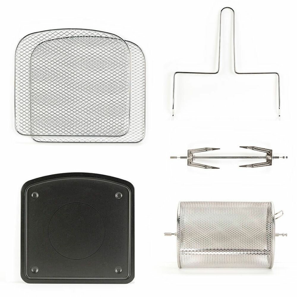 | Комплектация | 2 решетки, противень для сбора жира, вертел, корзина для жарки вращающуюся на 360º, ручка для гриля. (Все аксессуары можно мыть в посудомоечной машине) |