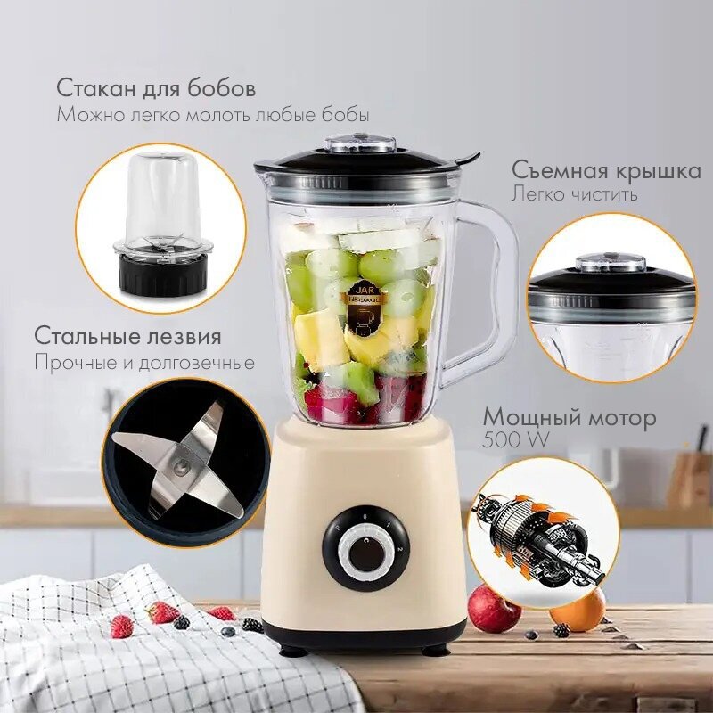 Домашний блендер/стационарный/измельчитель/миксер для смузи,коктейлей,500Вт,кувшин 1.5 литра, импульсный режим, бежевый интересное: