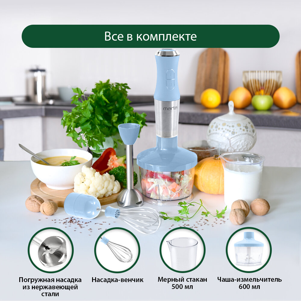 Погружной блендер 3 в 1, 2 скорости, мощность 800 Вт, небесно-голубой